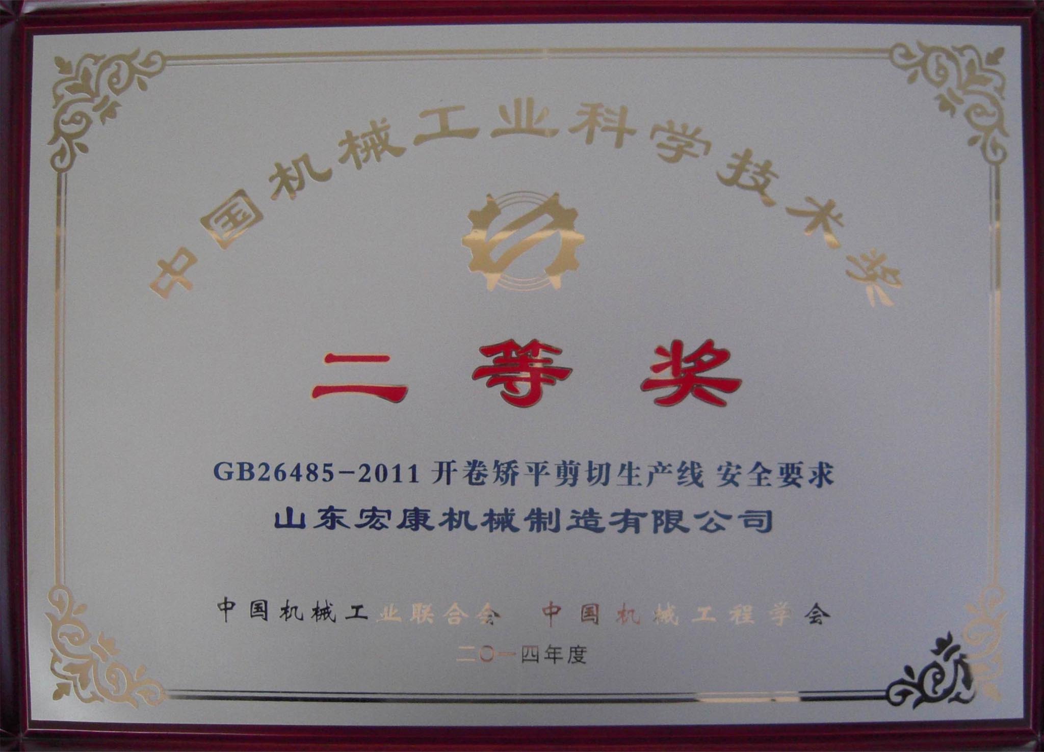 根據中國機械工業科學技術獎勵工作辦公室《關于表彰2014年度中國機械工業科學技術獎獎勵項目的通報》,集團公司主持制定的《GB26485-2011 開卷矯平剪切生產線 安全要求》國家標準獲中國機械工業科學技術進步二等獎。